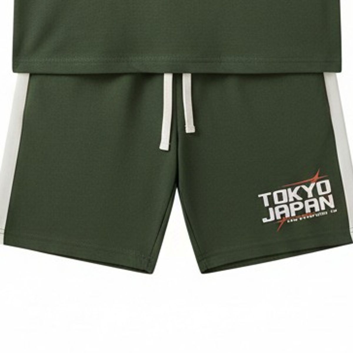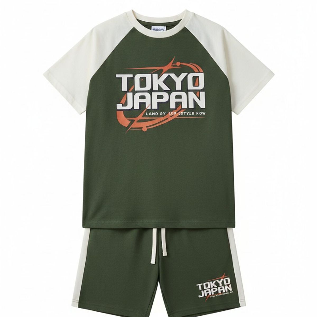 Two piece set. Round neck short sleeve T-shirt. Graphic print on chest. Bermuda shorts with elastic waistband and adjustable front drawstrings. Front pockets and piped detail at back.