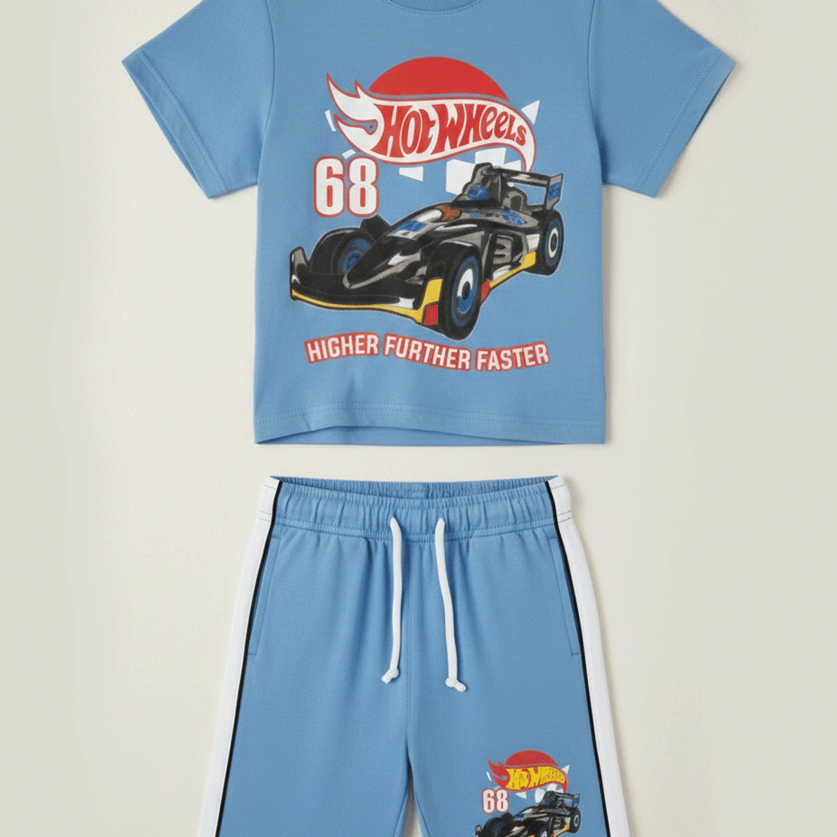 Two piece set. Round neck short sleeve T-shirt.Graphic print on chest. Bermuda shorts with elastic waistband and adjustable front drawstrings. Front pockets and piped detail at back.